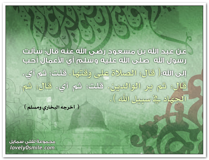 أي الأعمال أحب إلى الله قال الصلاة على وقتها قلت ثم أي قال ثم بر الوالدين قلت ثم أي لفلي سمايل