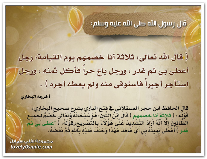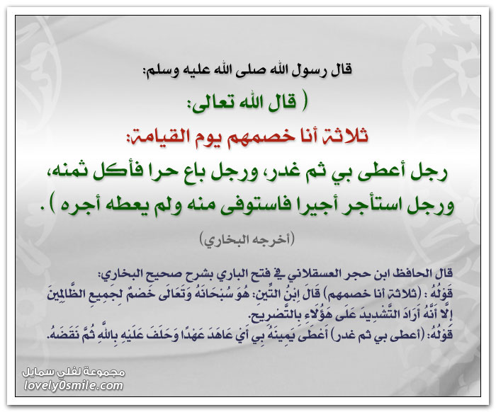 قال الله تعالى ثلاثة أنا خصمهم يوم القيامة رجل أعطى بي ثم غدر ورجل باع حرا فأكل ثمنه ورجل استأجر أجيرا فاستوفى منه ولم يعطه أجره لفلي سمايل