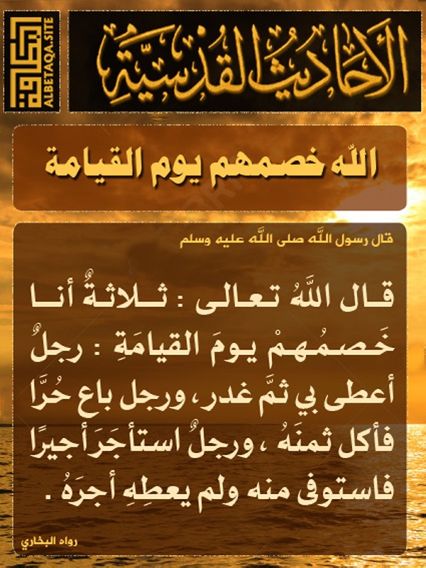 طير السعد On Twitter قال الله تعالى ثلاثة أنا خصمهم يوم القيامة رجل أعطى بي ثم غدر ورجل باع حرا فأكل ثمنه ورجل استأجر أجيرا فاستوفى منه ولم يعطه أجره Hadith