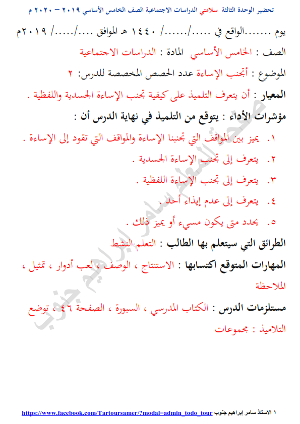 تحضير الوحدة الثالثة سلامتي في الدراسات الاجتماعية للصف الخامس الفصل الاول 2019 2020